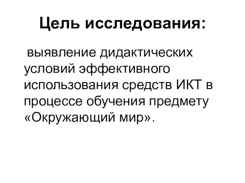 Цель исследования:	выявление дидактических условий эффективного использования средств ИКТ в процессе обучения предмету «Окружающий мир».