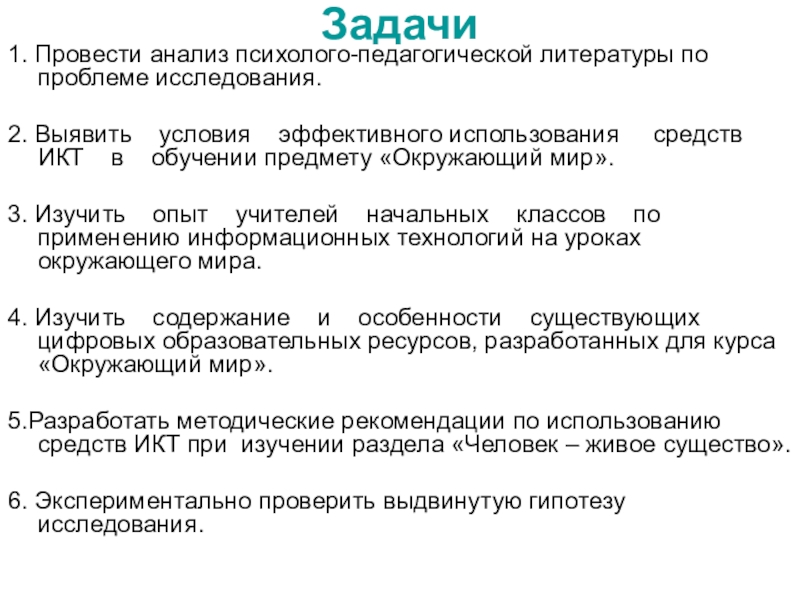 Задачи1. Провести анализ психолого-педагогической литературы по проблеме исследования.2. Выявить  условия  эффективного использования   средств