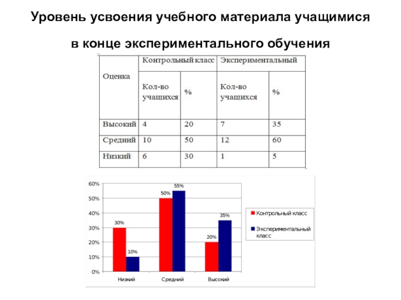 Слайд 18Уровень усвоения учебного материала учащимися в конце экспериментального обучения