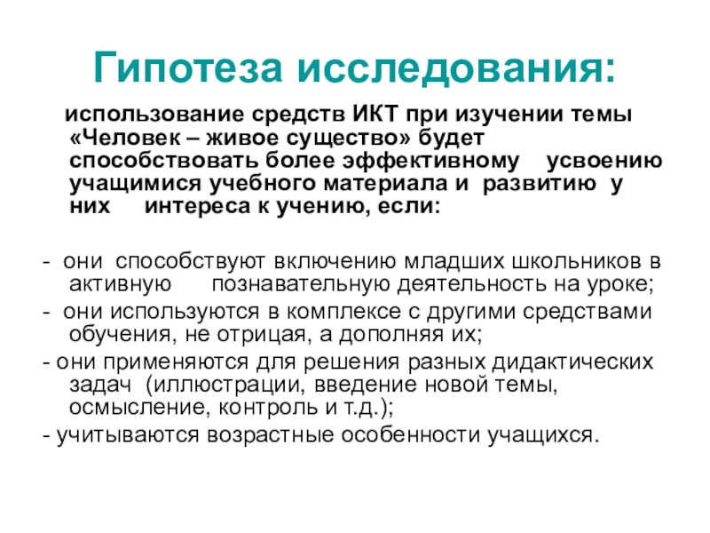 Гипотеза исследования:   использование средств ИКТ при изучении темы «Человек – живое существо» будет способствовать более
