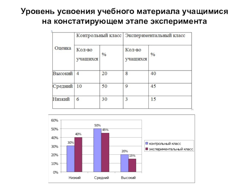 Слайд 12Уровень усвоения учебного материала учащимися на констатирующем этапе эксперимента