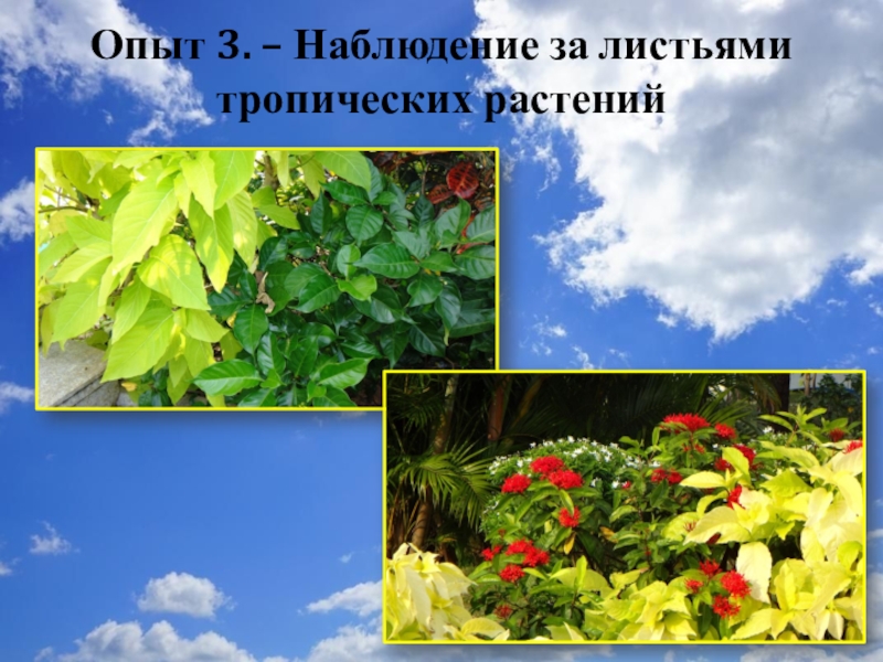 Слайд 18Опыт 3. – Наблюдение за листьями тропических растений