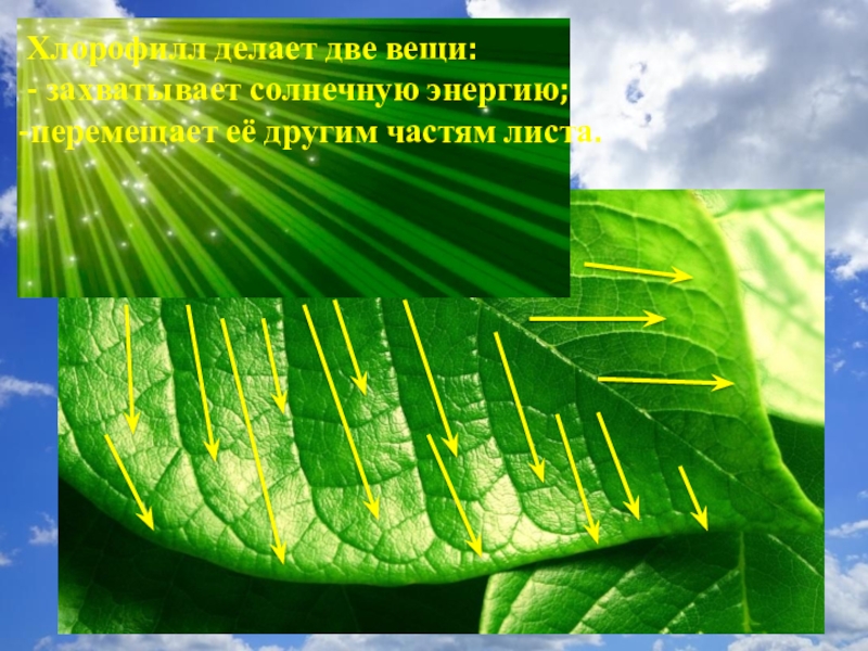 Слайд 11 Хлорофилл делает две вещи: - захватывает солнечную