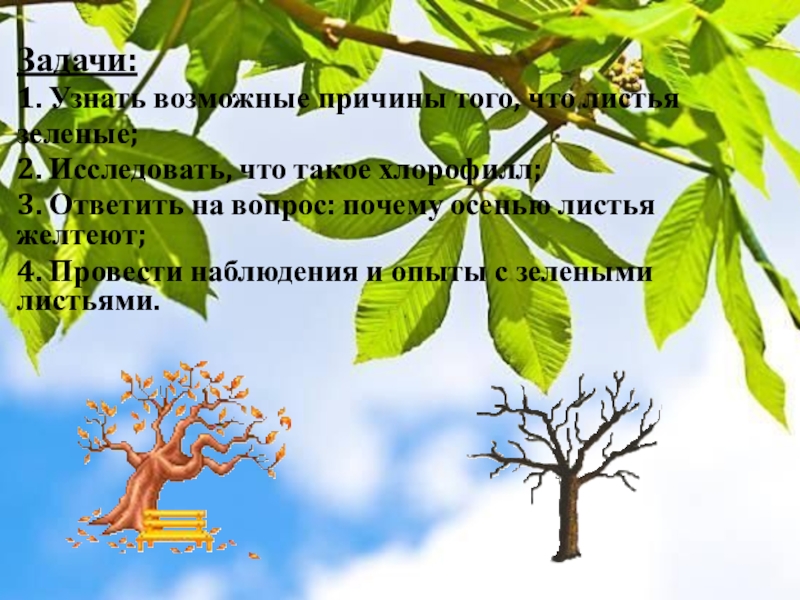 Задачи: 1. Узнать возможные причины того, что листья зеленые;2. Исследовать, что такое хлорофилл;3. Ответить на вопрос:
