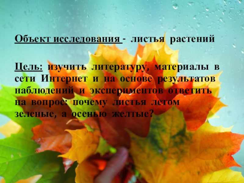 Объект исследования - листья растенийЦель: изучить литературу, материалы в сети Интернет и на основе результатов наблюдений