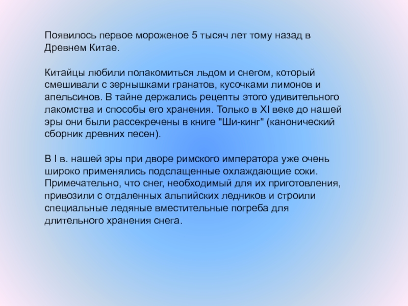 любили полакомиться льдом и снегом, который смешивали с зернышками гранатов, кусочками лимонов и апельсинов. В тайне держались рецепты этого удивительного лакомства и способы его хранения. Только в ХI веке до нашей эры они были рассекречены в книге "Ши-кинг" (канонический сборник древних песен).