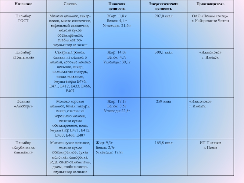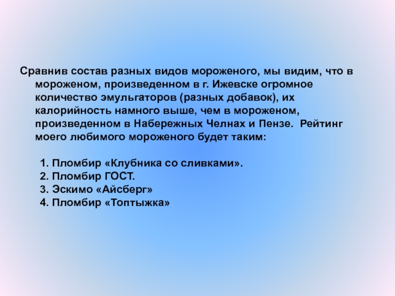 Слайд 20Сравнив состав разных видов мороженого, мы видим, что в мороженом, произведенном
