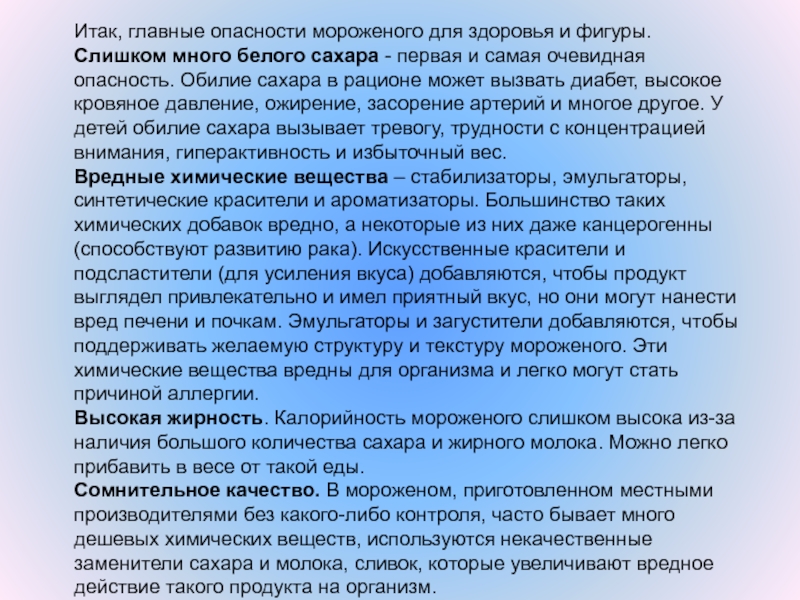 Слайд 15Итак, главные опасности мороженого для здоровья и фигуры.