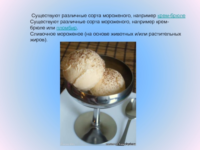 Слайд 9 Существуют различные сорта мороженого, например крем-брюле Существуют различные сорта мороженого, например крем-брюле или пломбир.