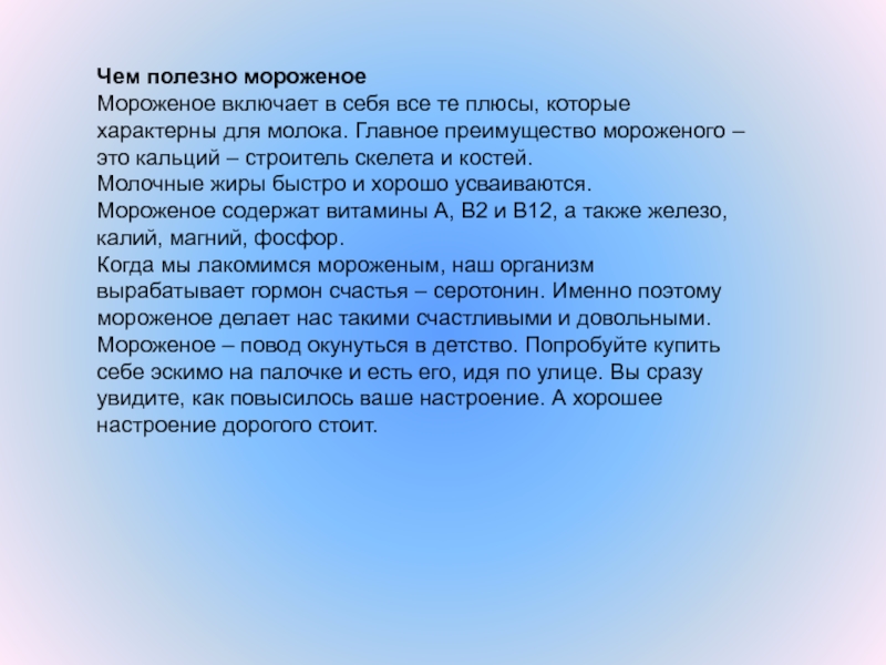 Когда мы лакомимся мороженым, наш организм вырабатывает гормон счастья – серотонин. Именно поэтому мороженое делает нас такими счастливыми и довольными.