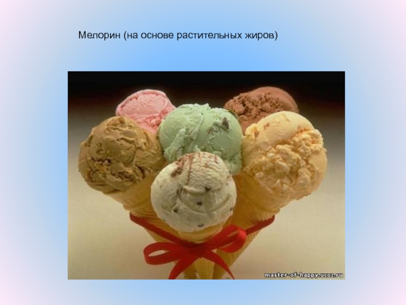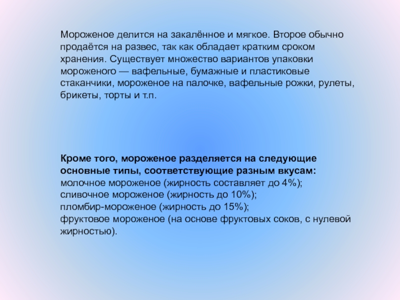 Слайд 13Мороженое делится на закалённое и мягкое. Второе обычно продаётся на развес,