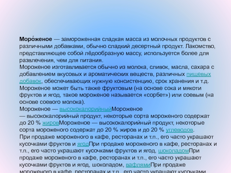 Слайд 3Моро́женое — замороженная сладкая масса из молочных продуктов с различными добавками, обычно