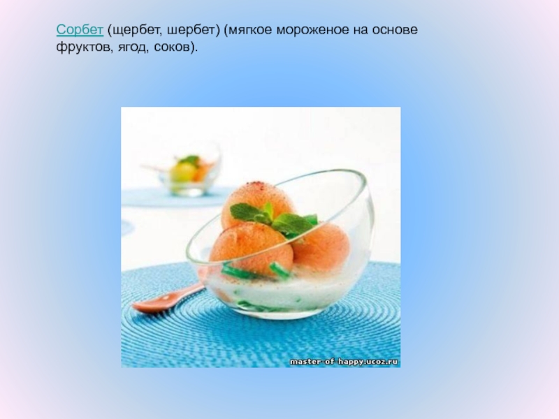 Слайд 10Сорбет (щербет, шербет) (мягкое мороженое на основе фруктов, ягод, соков).