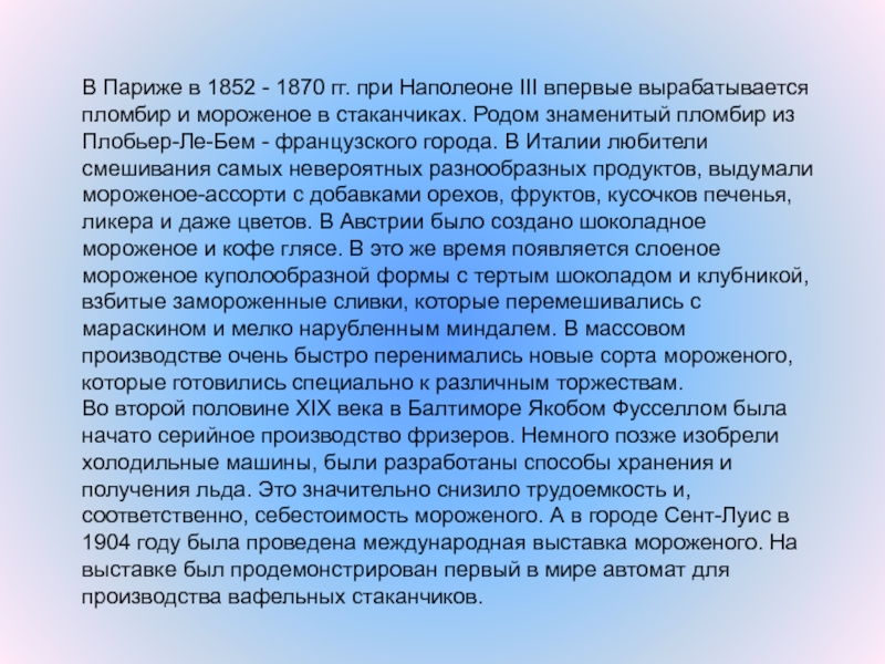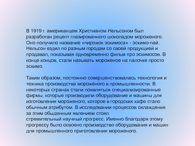 стремительный научный прогресс. Именно благодаря этому прогрессу было освоено производство оборудования и машин для промышленного приготовления мороженого.