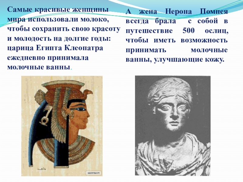 А жена Нерона Помпея всегда брала с собой в путешествие 500 ослиц, чтобы иметь возможность принимать молочные ванны, улучшающие кожу.