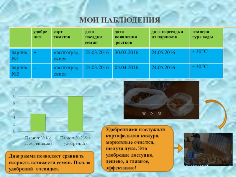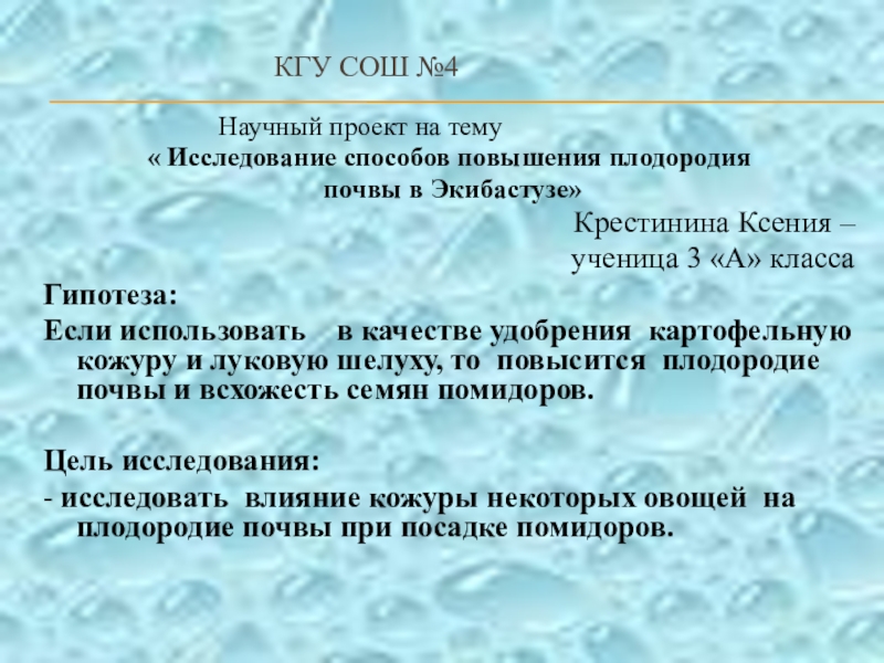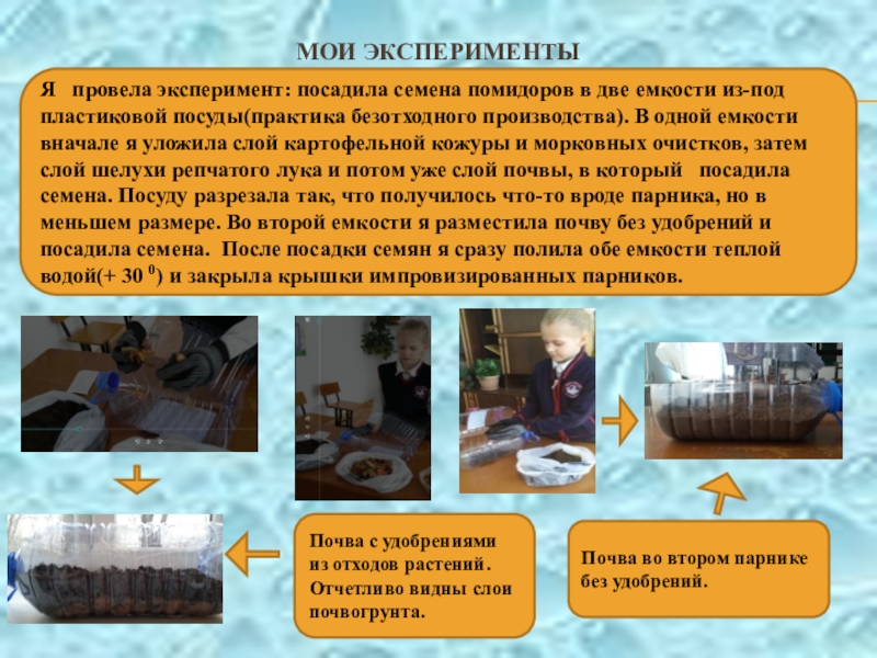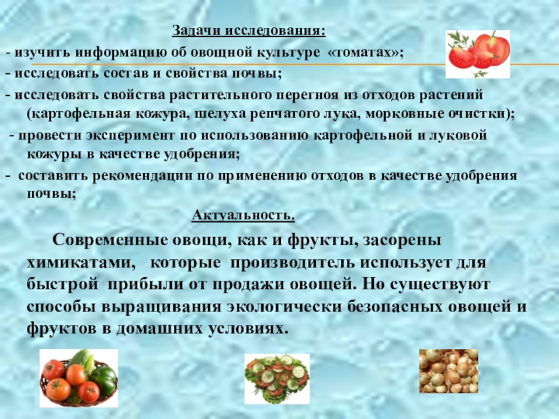 Главное свойство почвы – плодородие. Значит, первостепенная задача растениеводов – увеличить плодородие. Один из способов повышения плодородия – внесение удобрений в почву. К сожалению, человек для повышения урожая, использует химические удобрения. Это наносит вред плодам растений, и следовательно, здоровью человека. Но, оказывается, можно удобрять землю, не прибегая к химическим удобрениям. Это я исследовала в ходе работы над проектом.