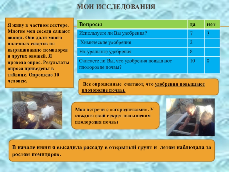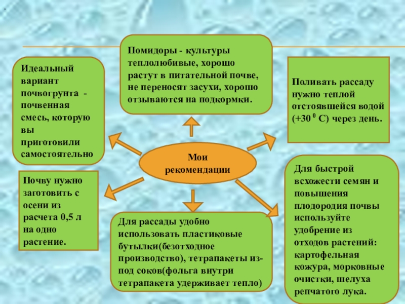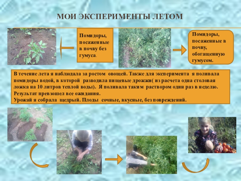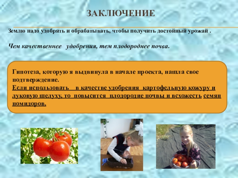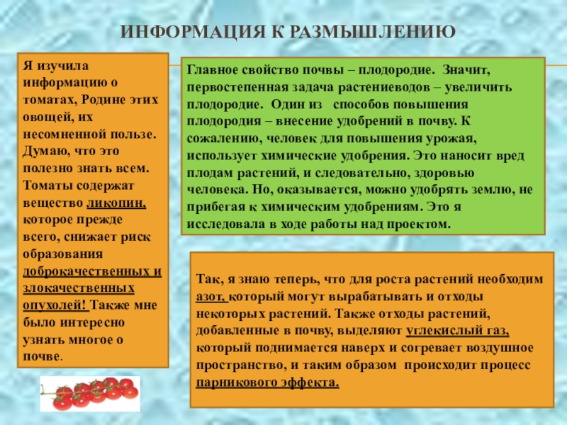 пользе. Думаю, что это полезно знать всем. Томаты содержат вещество ликопин, которое прежде всего, снижает риск образования доброкачественных и злокачественных опухолей! Также мне было интересно узнать многое о почве.