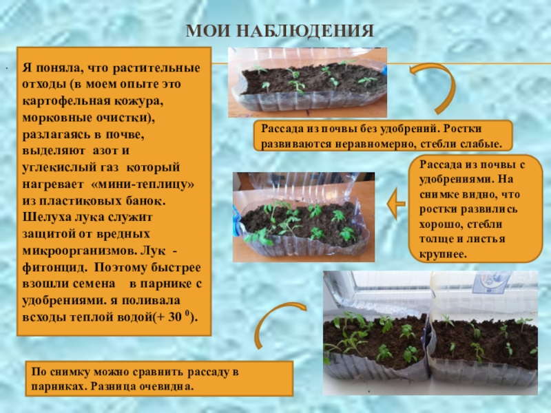 Так, я знаю теперь, что для роста растений необходим азот, который могут вырабатывать и отходы некоторых растений. Также отходы растений, добавленные в почву, выделяют углекислый газ, который поднимается наверх и согревает воздушное пространство, и таким образом происходит процесс парникового эффекта.