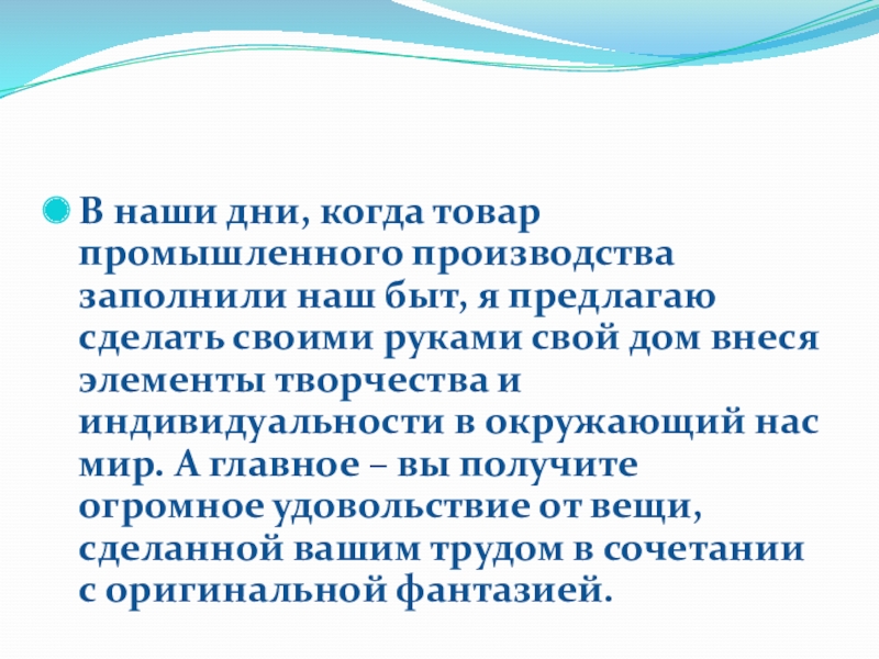 Слайд 19В наши дни, когда товар промышленного производства заполнили наш быт, я