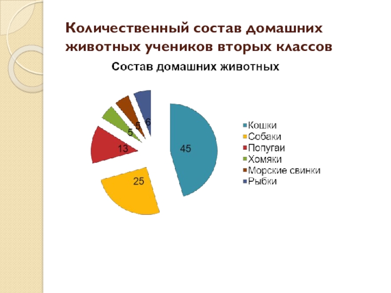 Данная диаграмма показывает, что кошек - 45, собак - 25, попугаев – 13, хомячков - 5, морских свинок - 5, рыбок - 6, волнистые попугайчики составляют 13% от общего числа всех домашних питомцев.