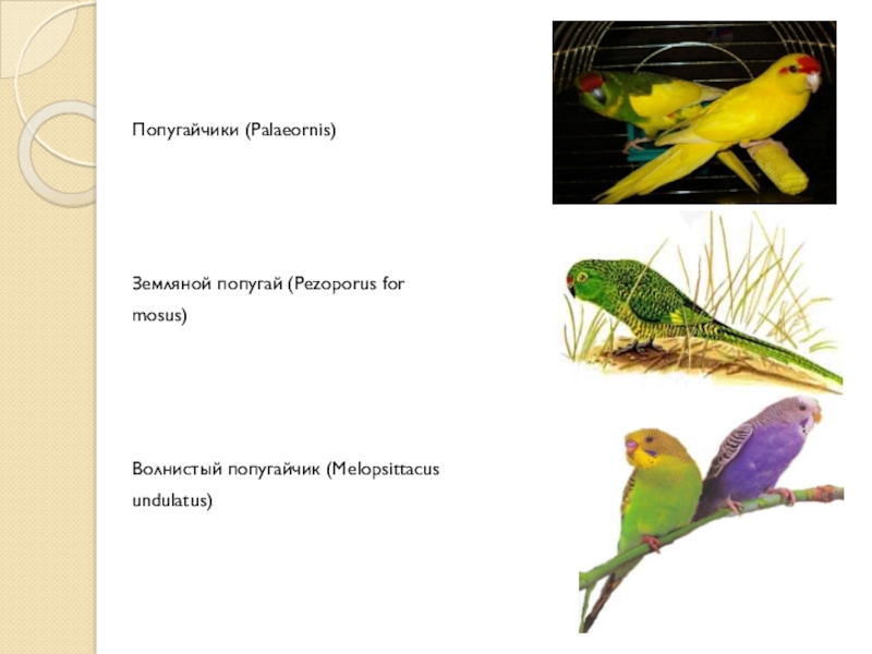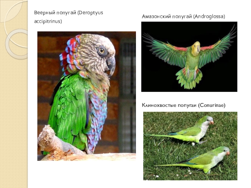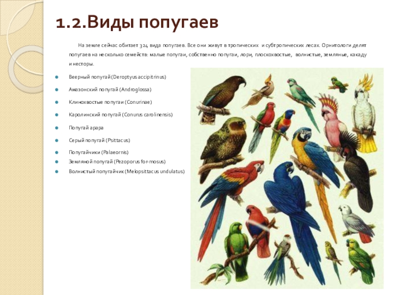 сейчас обитает 324 вида попугаев. Все они живут в тропических и субтропических лесах. Орнитологи делят попугаев на несколько семейств: малые попугаи, собственно попугаи, лори, плоскохвостые, волнистые, земляные, какаду и несторы.