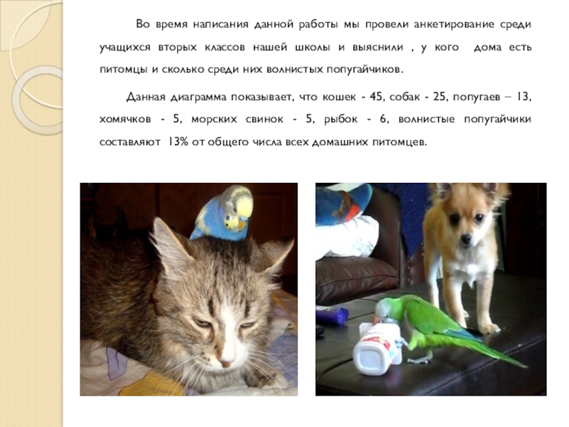 провели анкетирование среди учащихся вторых классов нашей школы и выяснили , у кого дома есть питомцы и сколько среди них волнистых попугайчиков.