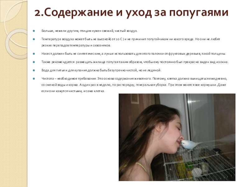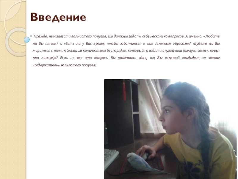 вопросов. А именно: «Любите ли Вы птиц»? и «Есть ли у Вас время, чтобы заботиться о них должным образом»? «Будете ли Вы мириться с тем небольшим количеством беспорядка, который наводят попугайчики (шелуха семян, перья при линьке)»? Если на все эти вопросы Вы ответили «да», то Вы хороший кандидат на звание «содержатель» волнистого попугая!