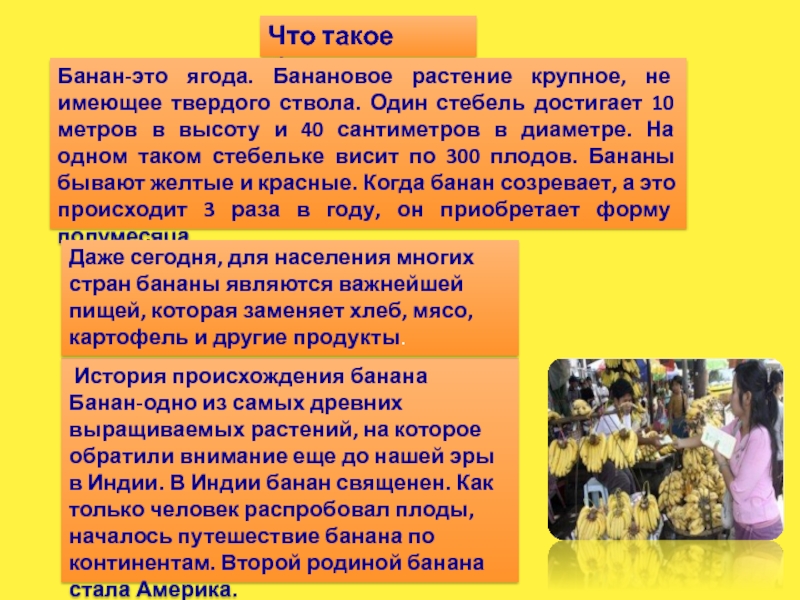 Даже сегодня, для населения многих стран бананы являются важнейшей пищей, которая заменяет хлеб, мясо, картофель и другие продукты.