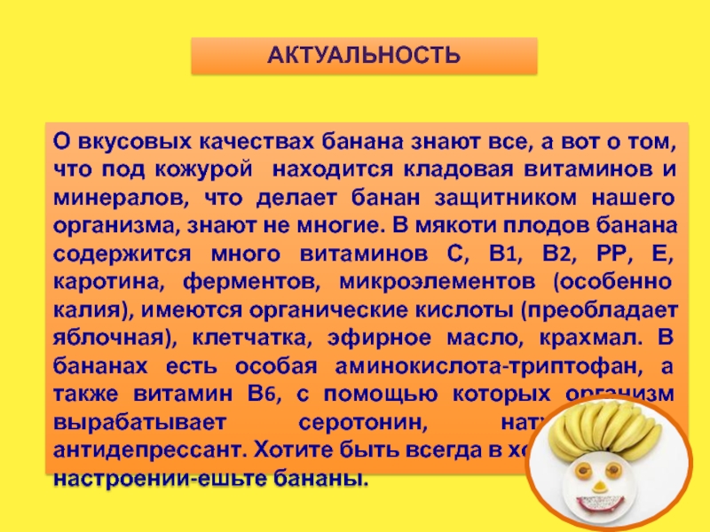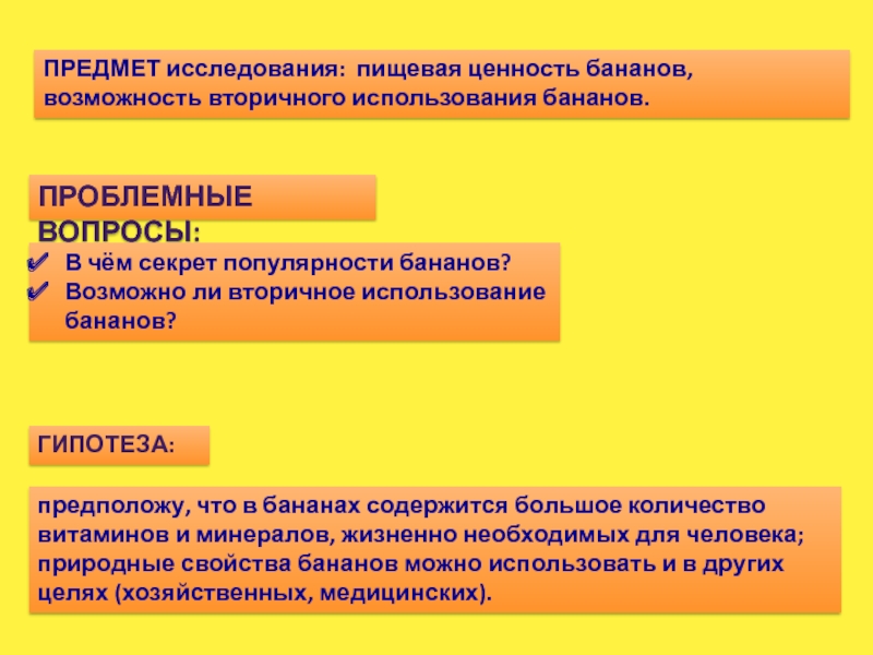 ПРЕДМЕТ исследования: пищевая ценность бананов, возможность вторичного использования бананов.