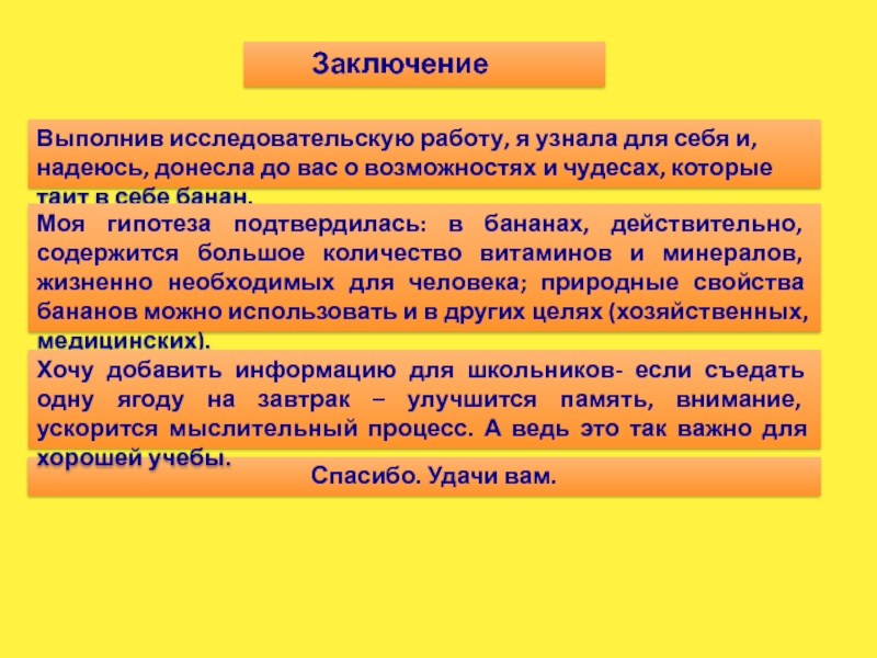 Выполнив исследовательскую работу, я узнала для себя и, надеюсь, донесла до вас о возможностях и чудесах, которые таит в себе банан.