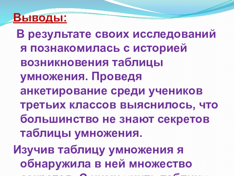 Выводы: В результате своих исследований я познакомилась с историей возникновения таблицы умножения. Проведя анкетирование среди учеников третьих
