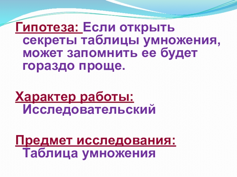 Гипотеза: Если открыть секреты таблицы умножения, может запомнить ее будет гораздо проще.Характер работы: ИсследовательскийПредмет исследования: Таблица умножения