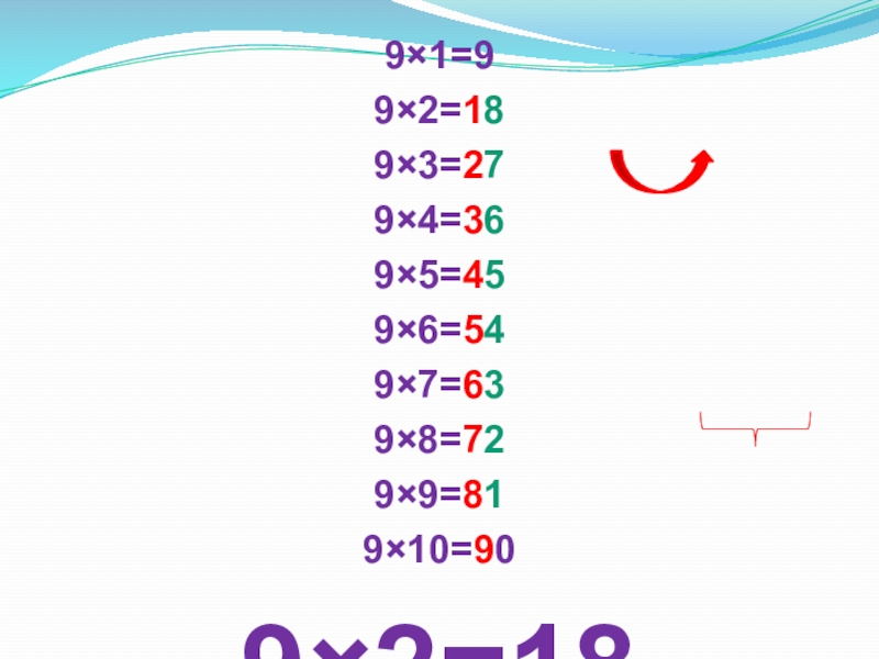 9×1=99×2=189×3=279×4=369×5=459×6=549×7=63 9×8=729×9=819×10=909×2=18            2-1=1  9×2= 18