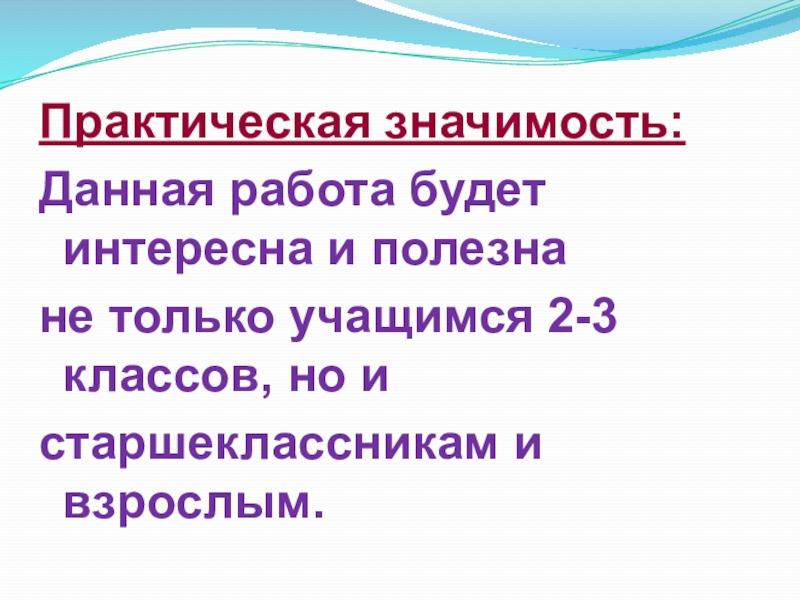 Практическая значимость: Данная работа будет интересна и полезнане только учащимся 2-3 классов, но истаршеклассникам и взрослым.