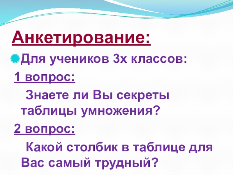 Анкетирование:Для учеников 3х классов:1 вопрос: 	Знаете ли Вы секреты таблицы умножения?2 вопрос: 	Какой столбик в таблице для