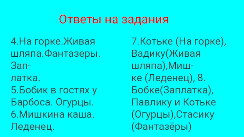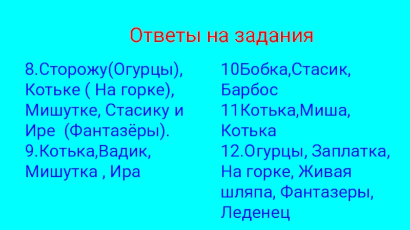 ке (Леденец), 8.Бобке(Заплатка),Павлику и Котьке (Огурцы),Стасику(Фантазёры)