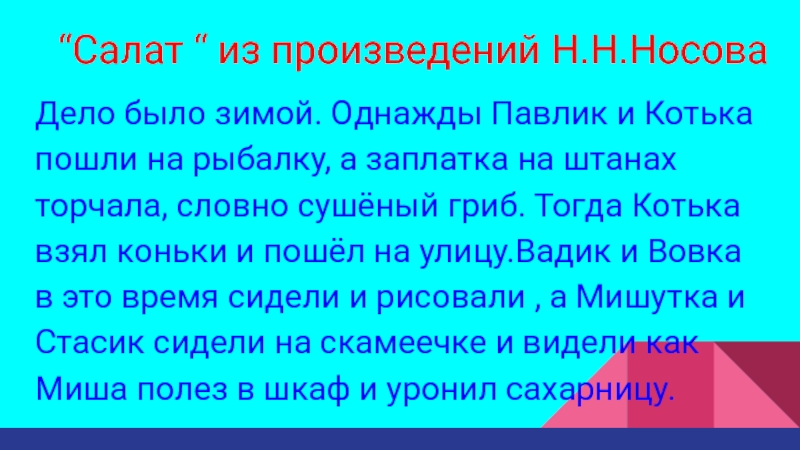 12.Огурцы, Заплатка, На горке, Живая шляпа, Фантазеры, Леденец