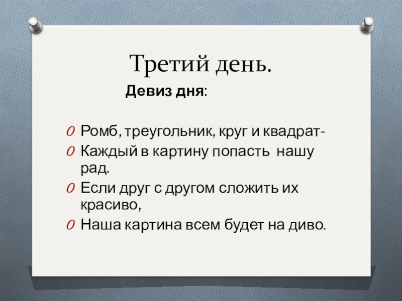 Третий день.          Девиз дня:Ромб, треугольник, круг и квадрат-Каждый