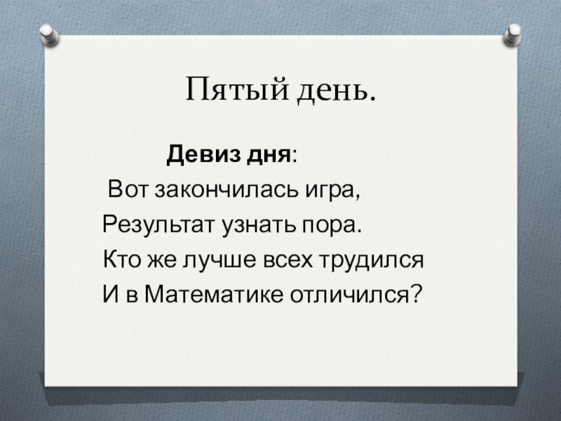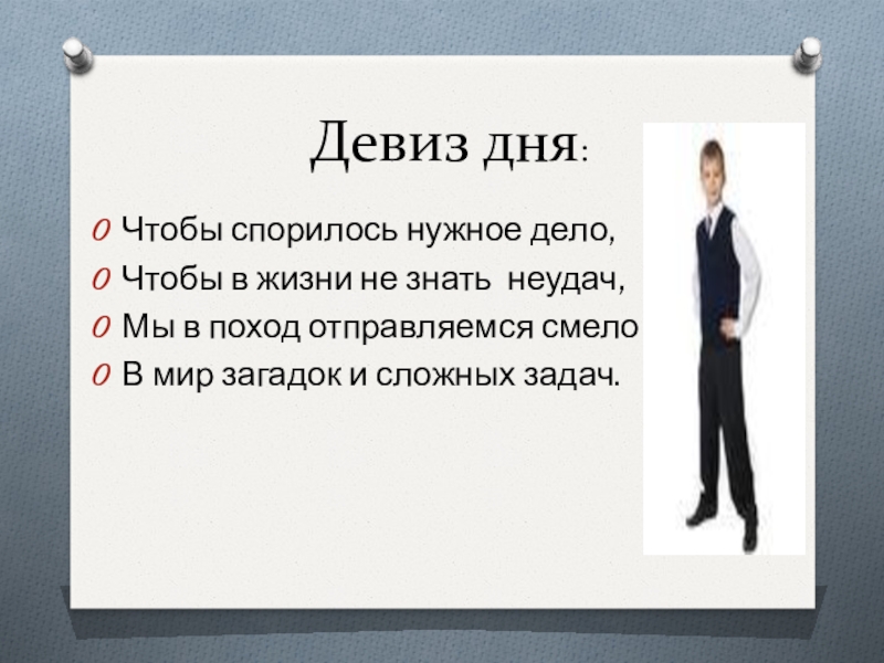 Девиз дня:Чтобы спорилось нужное дело,Чтобы в жизни не знать неудач, Мы в поход отправляемся смелоВ мир загадок и сложных задач.