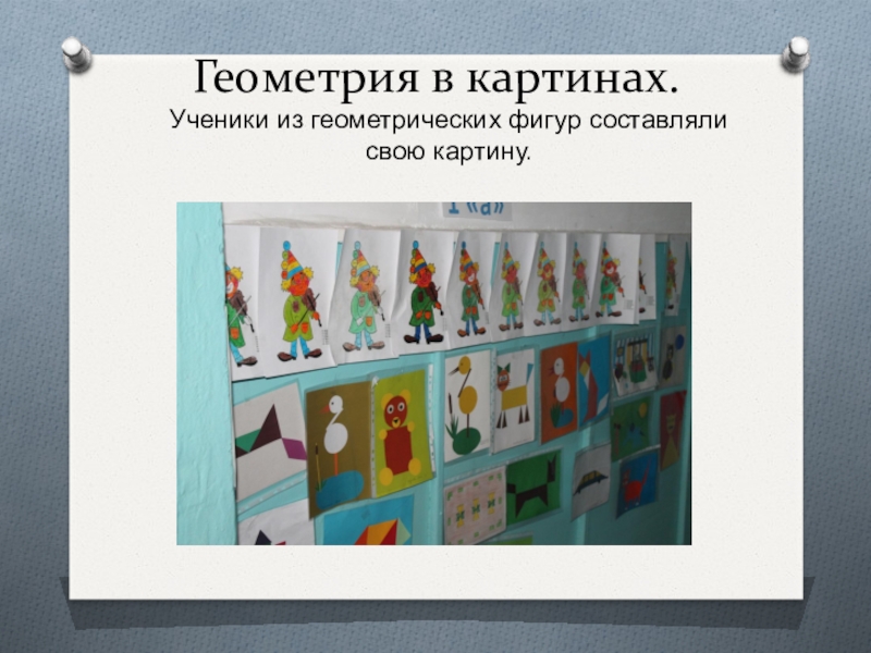 Слайд 10Геометрия в картинах. Ученики из геометрических фигур составляли свою картину.