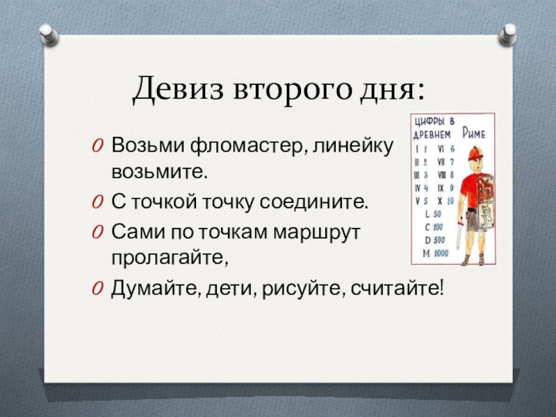 Девиз второго дня:Возьми фломастер, линейку возьмите.С точкой точку соедините.Сами по точкам маршрут пролагайте,Думайте, дети, рисуйте, считайте!