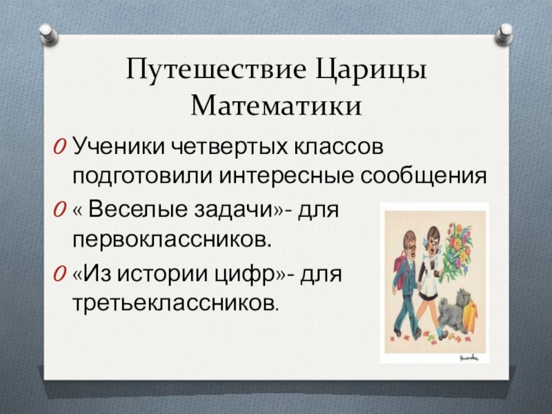 Путешествие Царицы МатематикиУченики четвертых классов подготовили интересные сообщения « Веселые задачи»- для первоклассников. «Из истории цифр»- для