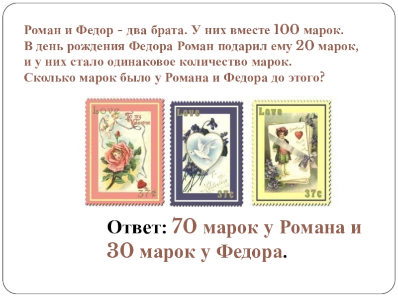 Ответ: 70 марок у Романа и 30 марок у Федора.