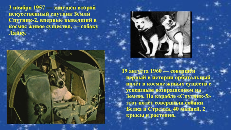 19 августа 1960 — совершён первый в истории орбитальный полёт в космос живых существ с успешным возвращением на Землю. На корабле «Спутник-5» этот полёт совершили собаки Белка и Стрелка, 40 мышей, 2 крысы и растения.