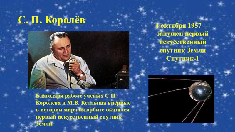 Благодаря работе ученых С.П. Королева и М.В. Келдыша впервые в истории мира на орбите оказался первый искусственный спутник Земли.