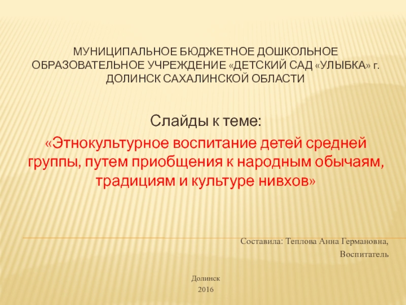 «Этнокультурное воспитание детей средней группы, путем приобщения к народным обычаям, традициям и культуре нивхов»