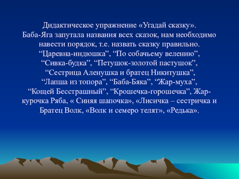 Слайд 3Дидактическое упражнение «Угадай сказку». Баба-Яга запутала названия всех сказок, нам необходимо навести
