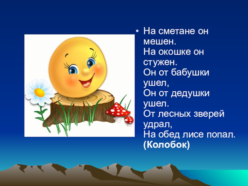 На сметане он мешен. На окошке он стужен. Он от бабушки ушел, Он от дедушки ушел. От