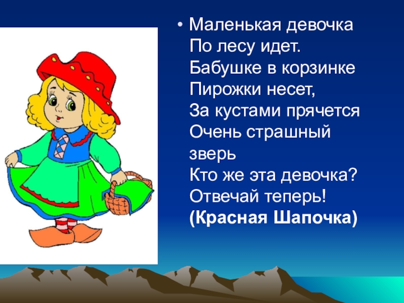 Маленькая девочка По лесу идет. Бабушке в корзинке Пирожки несет, За кустами прячется Очень страшный зверь Кто
