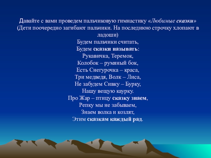 Слайд 11Давайте с вами проведем пальчиковую гимнастику «Любимые сказки» (Дети поочередно загибают пальчики. На последнюю